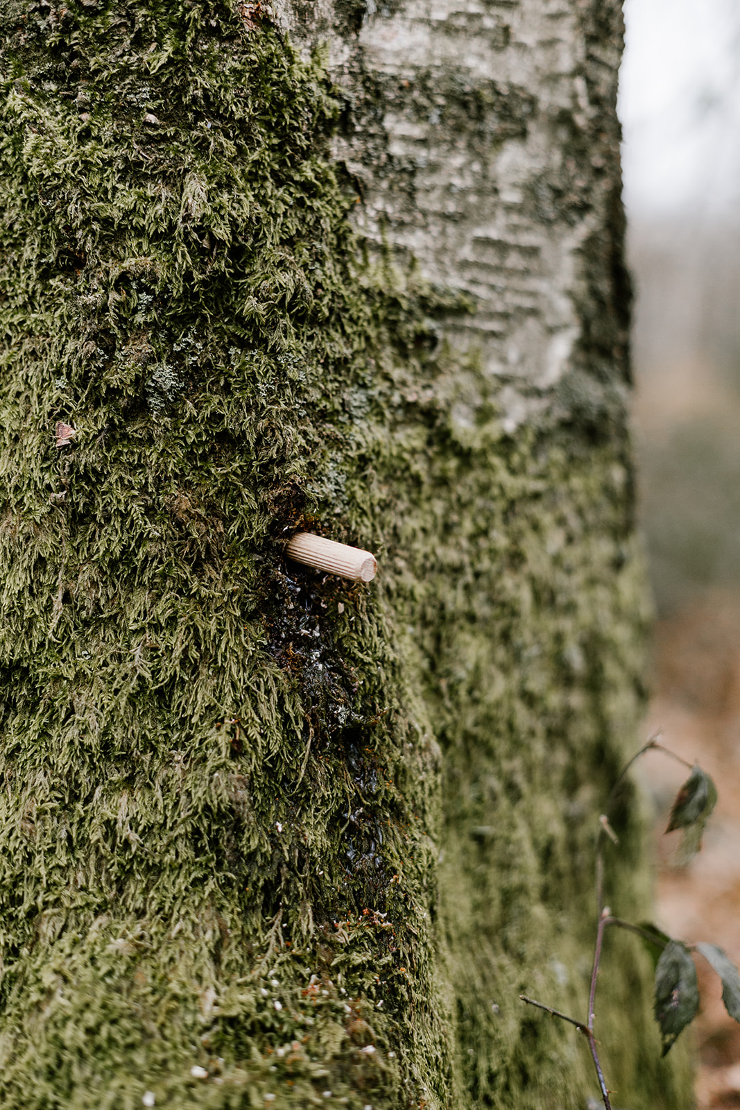 Chaque geste est mesuré : un petit trou d’environ 3 cm de profondeur, un écoulement naturel, puis la cicatrisation de l’arbre avec des chevilles en bois et de l’argile. Rien n’est laissé au hasard. Cette récolte douce permet aux bouleaux de poursuivre leur croissance, saison après saison.